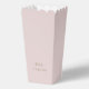 Delight wedding guests with a surprise midnight snack. This lovely wedding favour popcorn box features a floral rose bouquet and contemporary set of fonts in olive green, against a blush pink background.