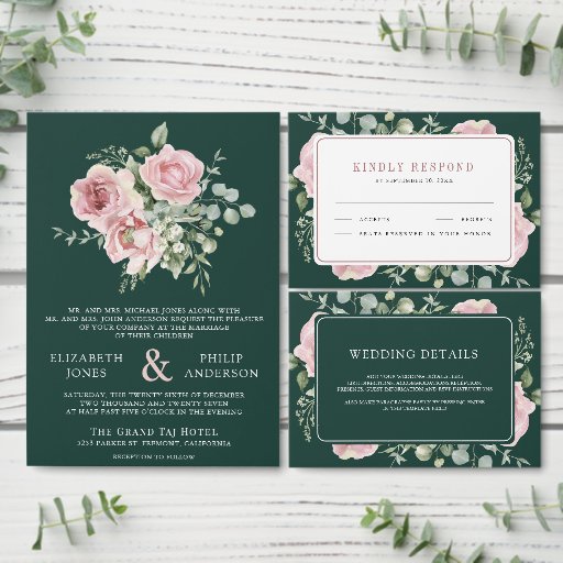 Blush Pink Floral Eucalyptus Emerald Green Wedding Invitation