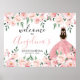Tiara Watercolor Floral Quinceañera Welcome Sign. This elegant and whimsical sign is perfect for greeting guests at your special celebration. It features a delicate blush pink floral theme with watercolor roses in soft pink hues and lush green leaves. "Welcome" is displayed in a mix of classic serif and elegant script fonts for a sophisticated yet fun look. On the right side, a beautifully illustrated girl wearing a sparkling pink tiara adds a regal touch, enhancing the Quinceañera theme.