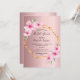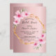 An elegant tropical summer bridal shower invitation. With a faux gold geometric frame decorated with light pink hibiscus, flowers tropical florals with some greenery. A blush pink faux metallic background.