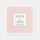 This elegant wedding paper napkin features a modern black and white typography design, with a touch of blush pink. The names of the couple are beautifully written in a hand-drawn style typography in a white frame with a stylish black border. Behind it there is a geometric pattern that consists of white crosses on a lovely pink background.