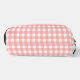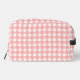 A pretty, blush pink gingham check pattern on customisable toiletry bags. This classic design is always in style! This zippered bag has a heart monogram design area where you can personalise with a name, monogram, initials or any text. This cute bag makes a fun and unique gift for her!