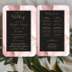 This elegant, modern wedding program fan features a blush pink agate background trimmed with gold faux glitter. The text appears in elegant gold coloured handwriting and copperplate fonts on an off-black rectangle.