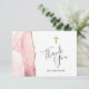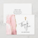 This elegant modern First Communion thank you card features a blush pink watercolor agate border trimmed with gold faux glitter. A small gold faux foil cross appears over the words "Thank You" in charcoal grey handwriting script on a white background. The customisable text includes your child's name on the front and an editable message on the back in italics. Ideal for a girl's First Communion.