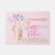 Girly blush pink and gold boho floral feather Summer Vibes doormat. This pretty doormat features the words "Summer Vibes" in hot pink, purple and aqua, with gold glitter sparkles confetti. This doormat also features a sparkly gold, pink, lilac, purple, blue and turquoise boho feather arrow.