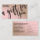 This is the perfect gift certificate business card for a trendy, stylish, girly, and modern businesswoman. This design features simple black handwritten brush script typography on a faux printed diagonal gold glitter and blush pink ombre gradient glamourous and chic background. It's the perfect way to allow your customers to buy a gift for their family and friends and at the same time promote your business.