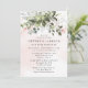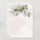 Design features light or blush pink watercolor splashes with printed gold simulated flecks. Design also features blush pink rose floral elements within a greenery bouquet or wreath. The wreath contains a succulent, eucalyptus and other greenery elements in shades of dark emerald green, sage green, dusty blue and more to fit all seasons that your wedding may fall within and colours that compliment the colour blush.