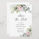 Blush Pink Greenery Save the date postcard. This stylish & elegant wedding invitation features gorgeous hand-painted watercolor blush pink roses. Find matching items in the Watercolor Eucalyptus Blush Pink Greenery Collection.