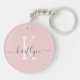 This modern blush pink keychain with your first name in a trendy script font in black and your first initial in a modern cap font in white is perfect for your keys.