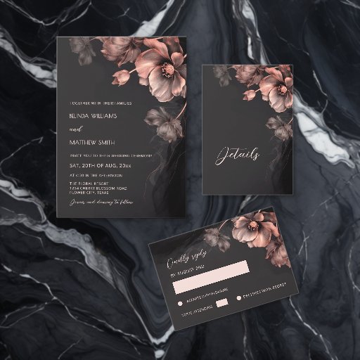 This elegant dark moody floral wedding invitation features AI created blush pink metallic flowers on a black background. Dark aesthetic wedding invitation with your photo on the backside.