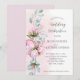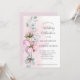 This wedding invitation features a soft pastel pink background adorned with watercolor-style floral artwork. On the left side, delicate pink peonies and lush green leaves cascade gracefully, adding a romantic and organic touch. The layout is clean and balanced, with elegant typography in a mix of flowing cursive and classic serif fonts that convey sophistication and warmth. The overall design feels timeless and inviting, perfect for a garden or winery celebration.