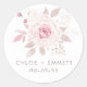 Beautiful blush pink rose is surrounded by soft pastel leaves and berries. An open rose outline adds a chic touch. Deep pink berries add a pop of colour. The bride and groom names follow in a modern and minimalist font. The wedding couple's wedding date follows in an elegant italics font. This sticker coordinates with