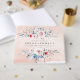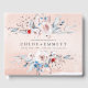 Soft blush pink roses are surrounded by soft pastel steel blue leaves and vines. Bright blue flowers add a pop of colour. A few tiny scarlet red flowers add a touch of spice. The wedding couple's names, wedding date and location are included. The back of the guest book is also blush pink, but with wide neutral stripes. An easy DIY wedding project that creates a beautiful wedding project. This wedding guest book is part of the Blush Pink collection. It contains many items to easily personalise your wedding ceremony and reception. You should see a link to it. If you don't or need help with an item, please contact me.