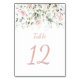 Table numbers with a watercolor floral drop border of blush pink roses and sage green greenery. Please Note: You will need to purchase and edit these table cards one at a time if you wish to have the numbers pre-printed.