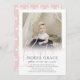 Minimalist baptism invitation in with baptism written in a blush pink brush script. Add name and text in soft grey. Personalise with a photo of your baby. The back features a blush and white pattern with crosses.