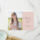 This minimalist graduation thank you card features a large photo and casual script lettering. Against a blush pink background, "Thank you" is written in casual modern script, with the graduate's name and graduation year below. To the left, add a large photo of the new grad. The back is blank and can accommodate additional photos or a personalized note to recipients.
