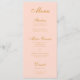 A simple menu that has a very modern colour, blush pink, and uses elegant calligraphic script for title and subtitles. All text is golden.