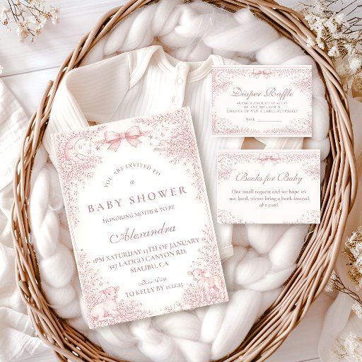 A soft and elegant baby shower design featuring delicate vintage-style blush pink toile illustrations. The frame is adorned with charming lambs, florals, celestial accents, and a romantic bow, creating a timeless storybook nursery aesthetic. Perfect for a classic, feminine celebration with a refined heirloom feel. The gentle pink palette and detailed engraving style give the design a sophisticated yet sweet atmosphere that works beautifully for traditional or cottagecore baby showers.