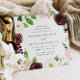 Our square shaped Blush Romance wedding invitation surrounds your wedding day details with a wreath of watercolor blossoms in ivory, burgundy marsala and blush pink, accented with lush green botanical leaves and foliage.