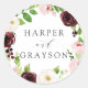 Seal your invitation envelopes or favours with these elegant floral wedding stickers featuring your names framed by a watercolor wreath of lush green foliage and blooming flowers in blush pink, ivory and burgundy marsala. Personalise with your names in classic off black lettering accented with calligraphy script. Coordinates with our Blush Romance wedding collection.