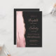 The left-hand edge of this elegant modern wedding invitation features a blush pink watercolor agate border trimmed with faux rose gold glitter. The customizable text combines rose pink handwriting, copperplate and italic fonts on an off-black background. The reverse side provides space for wedding details on a solid off-black background, along with a QR code guests can scan to visit your website and RSVP, which saves the cost of printing and mailing separate RSVP cards.