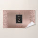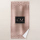 Luxurious looking bath towel set on (faux) metallic rose gold foil with blush rose gold sparkly glitter borders. A distinctive monogram frame displays your personal or business initials as an instant logo. You can easily change the initials on the Personalisation template.