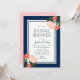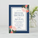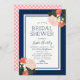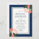 Elegant Floral Bridal Shower invitation featuring blush roses, dark coral and yellow flowers, and green leaves with an off white centre and blue borders against a blue background on the front. Invitation has a sweet blush coral gingham back side. Check out matching and other bridal shower/wedding items here https://www.zazzle.com/rosewoodandcitrus/gifts?cg=196540141241316965&rf=238364477188679314