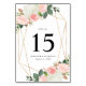 Stylish, floral wedding table number cards featuring your table number, names, and wedding date surrounded by a faux gold foil geometric frame adorned with blush pink watercolor roses, white hydrangeas & lush green and copper leaves. The elegant table numbers are designed to coordinate with our Blush Spring Floral wedding collection. Add each table number card to your cart individually.