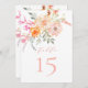 A simple and modern baby shower table number with a hand-painted watercolor bouquet, script lettering, and elegant typography. The card is decorated with a floral arrangement in the top left-hand corner. There are roses, dahlias, snapdragons, eucalyptus, and more. The sign reads "table" in flowing script and the custom number below. Please note that you will need to customise and order each table number separately. Part of our Baby in Bloom | Blush & Teal Spring Floral Baby Shower set - view the collection on this page, below the product image! Feel free to message me with any questions, I'll be happy to help!