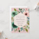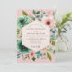 This elegant design features a romantic watercolor arrangement of lush florals. Striking teal peonies and soft blush anemones are artfully placed amongst verdant green foliage. The entire composition is set against a delicate pale pink background, creating a modern and artistic atmosphere for your special day.