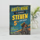 With its bold yellow typography and retro aesthetic, this invite is ideal for 5th birthdays, 10th birthdays, or any kid obsessed with bicycles and racing. The layout is clean and energetic, making all your essential party details from the "Let's Ride" tagline to the RSVP info easy for guests to read. Fully customize the name, age, date, and location to create a rugged and memorable invite for your little shredder!