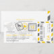 A boarding pass inspired ticket invitation with fun passport stamp details and airmail stripes. Shown in shades of Sunshine Yellow, Dark Grey and Light Grey. Back side includes extra space for any hotel, travel or website information.