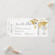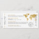 Boarding pass save the date for a destination wedding featuring a faux gold foil world map, our romantic aeroplane with a heart wedding logo, and a personalised custom wedding passport stamp with your names, wedding date, and location. All fonts, text, and colours are editable aside from the gold globe image, but Paper Grape offers several other colour options if you need them to create your travel theme plane ticket wedding date announcement card with your exact wedding abroad colour scheme. Use this unique and fun save the date for a wedding in any location anywhere in the world.