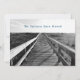 Coastal themed new address announcement cards. Flat cards have text and images on both sides. A wooden boardwalk image in black and white on the front, with one line of dark blue text across the top. Add more info to the back of the card over a beach scene with a large shell washed up.