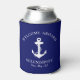 A chic modern nautical-themed can cooler for your boat's guest that features a white anchor on a navy blue background. You can personalise the "Welcome Aboard" text and your boat's name and location in elegant white typography.