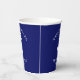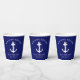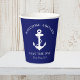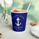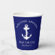 Modern nautical-themed paper cups for your boat that feature a white illustration of an anchor on a dark navy blue background. Personalise the "Welcome Aboard" text and your boat's name and location in elegant white typography.
