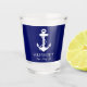 A monogram nautical-themed navy blue shot glass for your boat with an illustration of a white anchor. Personalise with your boat's name and location in elegant white typography and script.