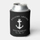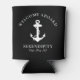 A modern nautical-themed can cooler for your boat that features a white anchor on a black background. You can personalise the "Welcome Aboard" text and your boat's name and location in elegant white typography and script.