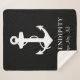 A chic modern nautical-themed blanket for your boat featuring a white anchor on a black background. You can personalise your boat's name and location in elegant white typography.