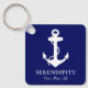 A chic modern nautical-themed keychain for your boat featuring a white anchor on a navy blue background. Personalise your boat's name and location in elegant white typography and script.