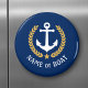 A Personalised round magnet with your boat name, family name or other desired text as needed. Featuring a custom designed nautical boat anchor, gold style laurel leaves and star emblem on navy blue or easily adjust the primary colour to match your current theme.