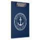 Clipboard featuring a white, elegant anchor and rope emblem with your custom boat name and hailing port on a dark blue background.