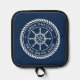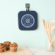 Pot holder featuring a white, elegant ship's wheel and rope emblem with custom boat name and hailing port (or other custom text) on a dark blue background.