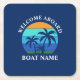 Boat Name Sun Palm Trees Welcome Aboard Blue Square Paper Coaster