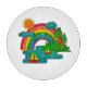 Colourful landscape composition in cartoon style with boats sailing the river sun clouds and rainbow