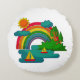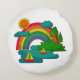 Colourful landscape composition in cartoon style with boats sailing the river sun clouds and rainbow