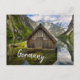 Photo postcard of a wooden boathouse cabin inside Obersee lake surrounded by beautiful high Alps mountains in a Bavaria landscape in the south eastern tip of Germany, near the border with Austria with the text 'Germany'.