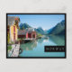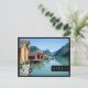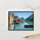 Postcard of a landscape with boathouses in the village of Fjærland (Mundal) and mountains with reflection in the water of the fjord Fjærlandsfjord, Sogn og Fjordane in Norway with a black frame and the text: 'Norway'.