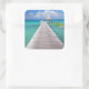 Sticker with multiple boats at a jetty in the clear turquoise lagoon of a tropical island in French Polynesia in the Pacific ocean.