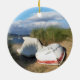 A photographic design of boats in the sand dunes and distant boats moored in the harbour. Wales UK.